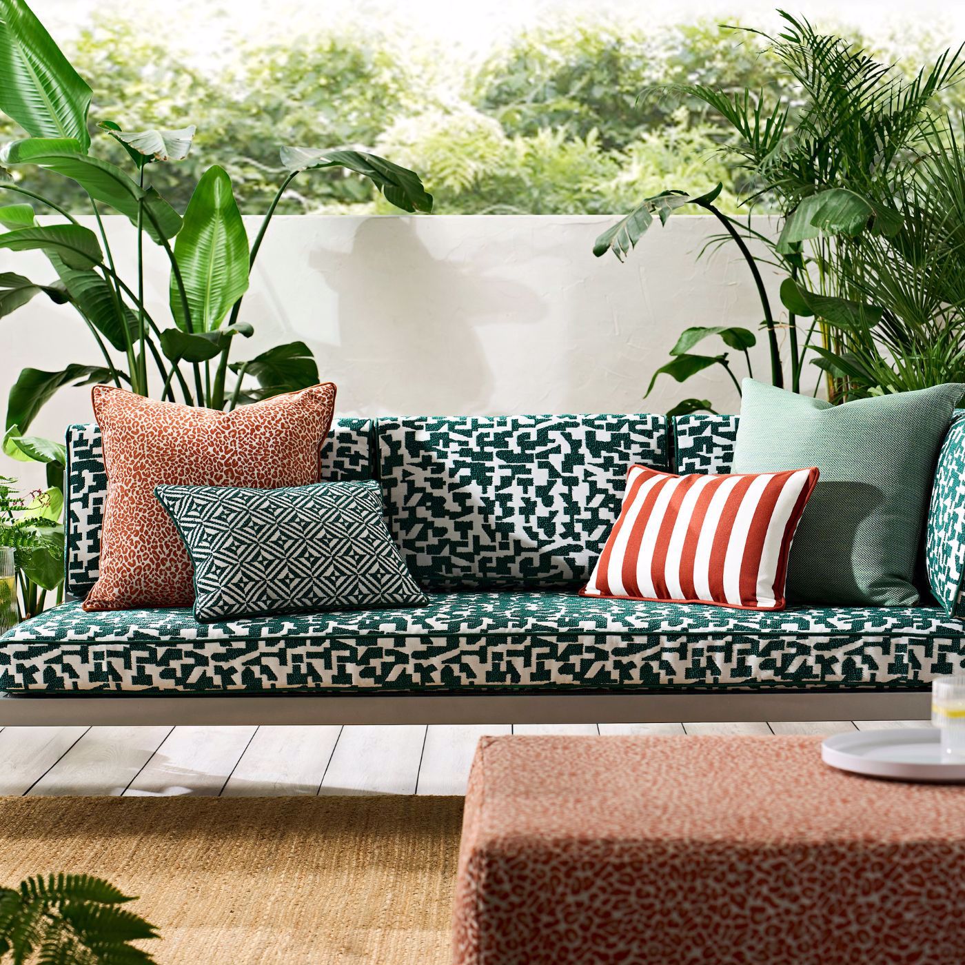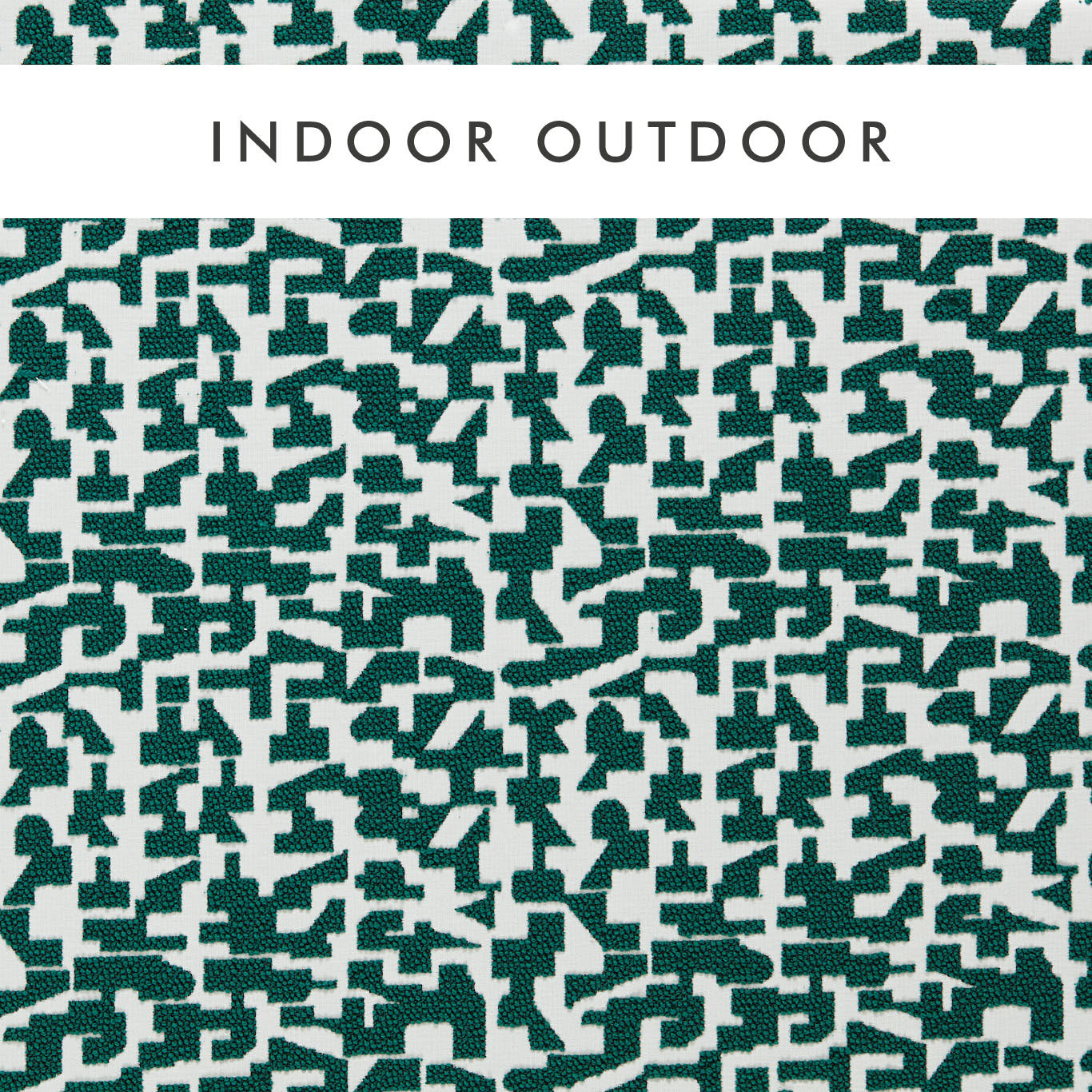 Kaleia features a bold, playful abstract design crafted from a beautiful chunky yarn that has a tactile quality. This robust material is perfect for outdoor applications, combining style with durability.