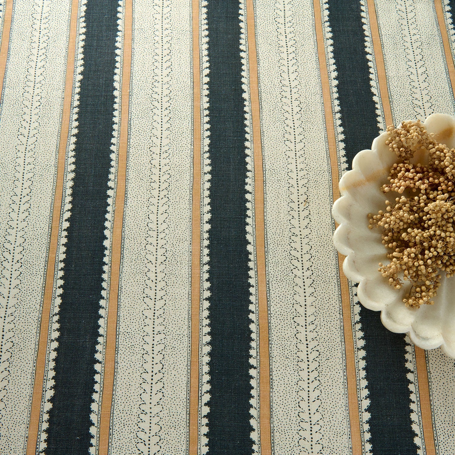 Drawing inspiration from an original French archive sample, this stripe is an artisan mix of bands of colour and delicate pattern. Printed on pure linen, there are 19 colourways available, ranging from maroon and tawny hues to the ever-popular blues and greens. The new stripe collection’s appeal lies in its versatility; whether it takes centre stage as a hero design or plays a supporting role, it is undeniably beautiful.