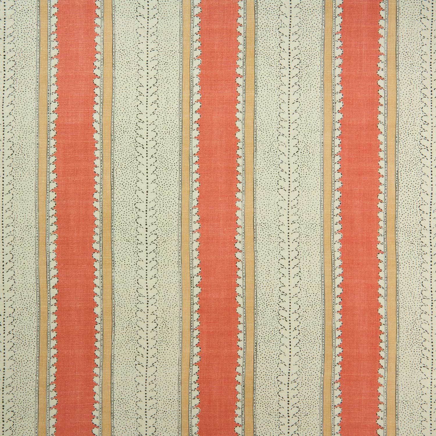 This lovely printed stripe on pure linen fabric, with its bright colour bands and subtle dots and dashes, is suitable for both curtains and upholstery.