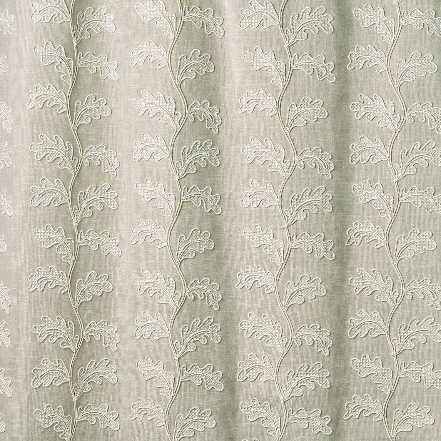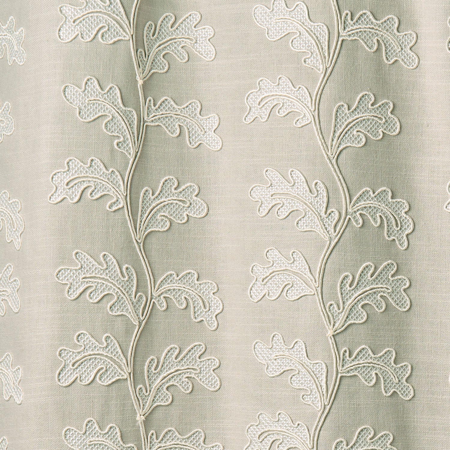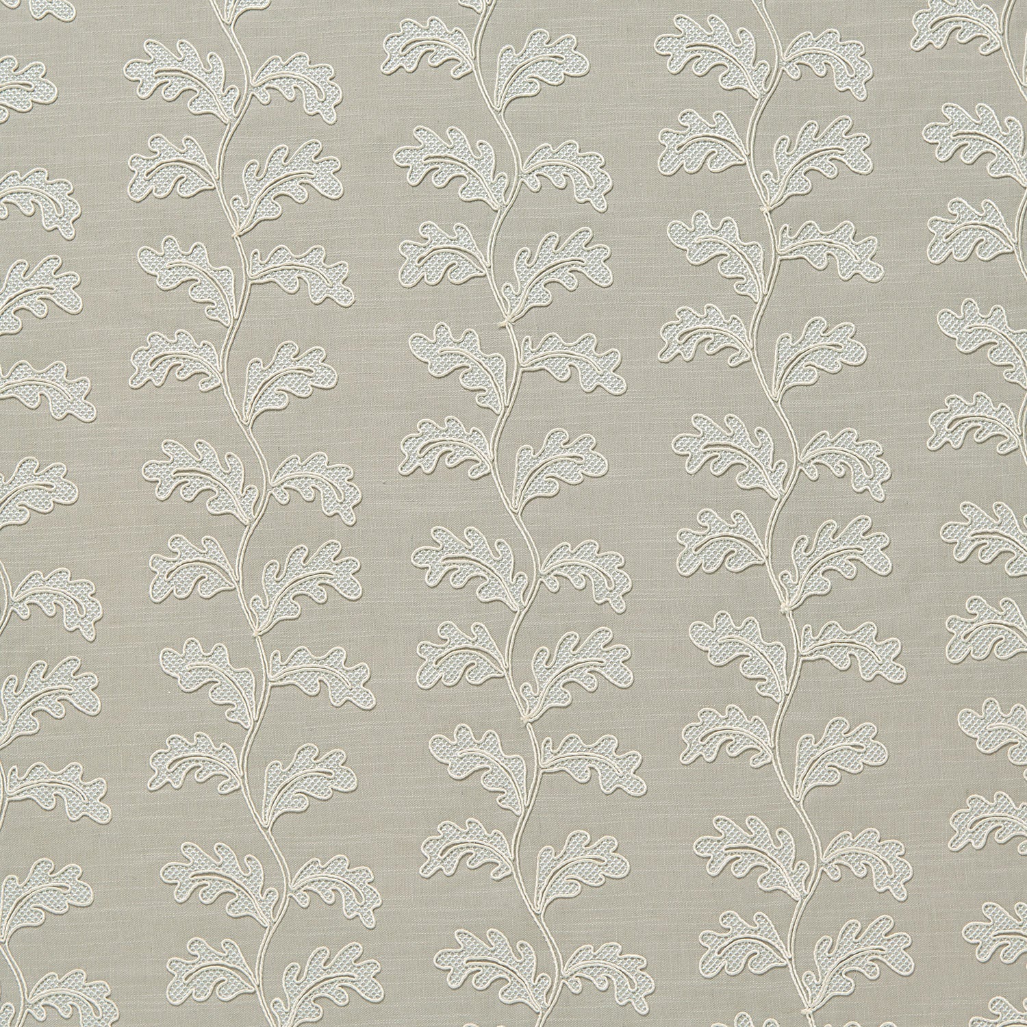 Striking in scale, this classical embroidery presents a stylised oakleaf trail, stitched with exquisite detail using the traditional couching technique, where cord is laid and secured to the fabric. Flowing leaves unfurl across a soft neutral ground, their sweeping lines brought to life in pure white thread. Woven on a cotton-linen ground, the design balances grandeur with delicacy, making it an inspired choice for curtains, headboards, or decorative upholstery. With its bold scale and classical detailing, it brings presence and distinction to all interiors.