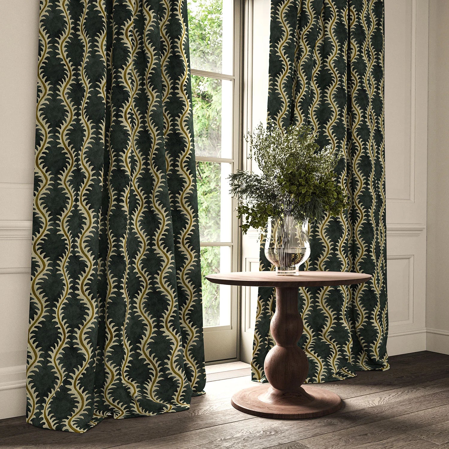 The rich pile of velvet, known for its softness, adds depth to Helter Skelter's iconic stylised fern pattern. Utterly timeless, this luxurious printed velvet is suitable for both upholstery and curtaining.