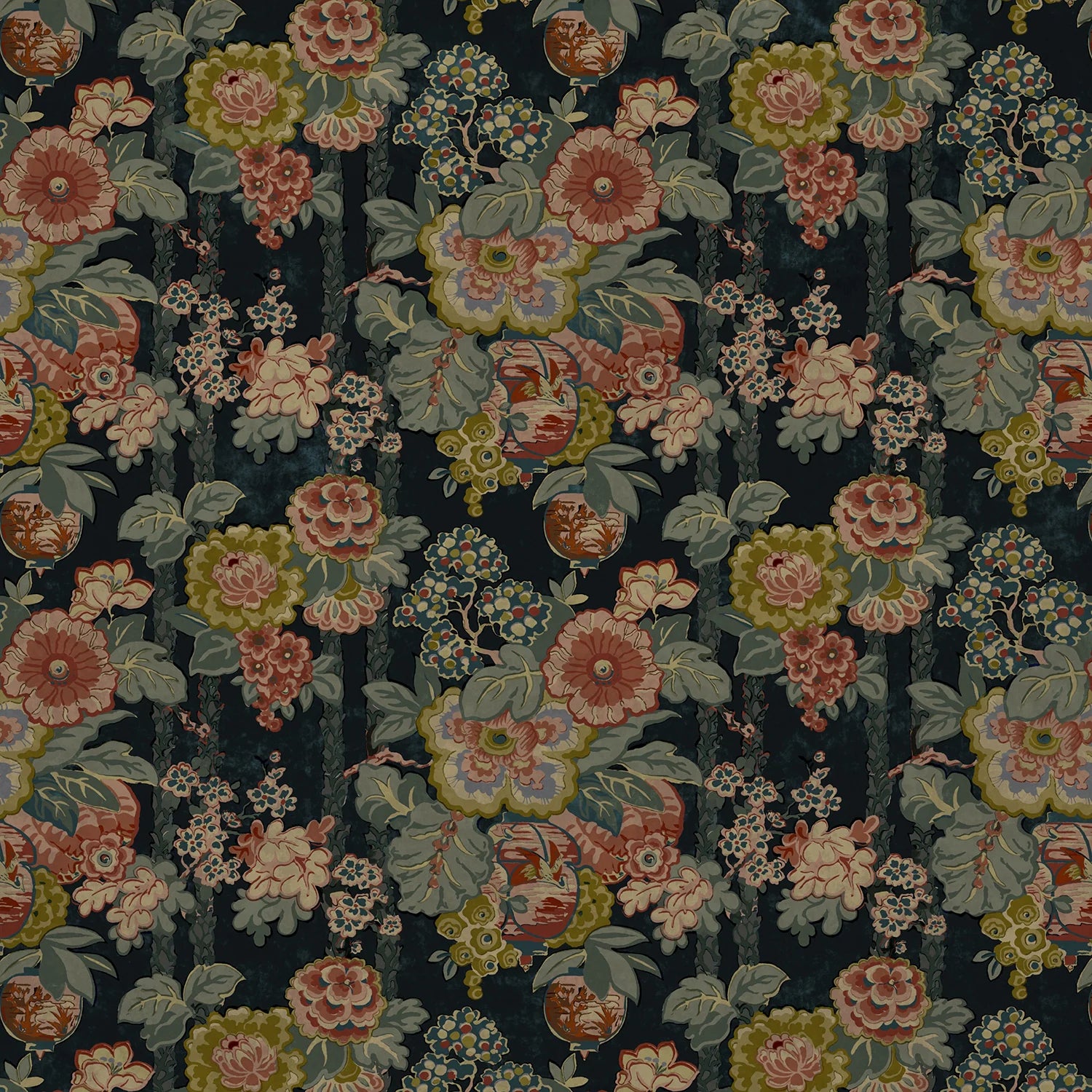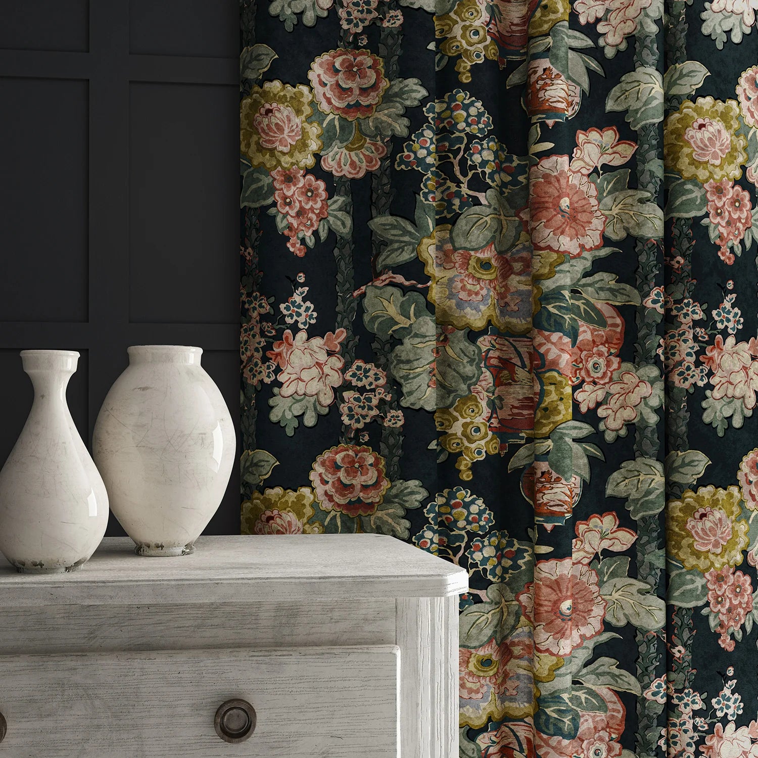 Louis, which was originally printed on linen, is now available on rich, indulgent velvet fabric. The abundant pattern of stylised flowers would look dazzling on a sofa or as curtains.