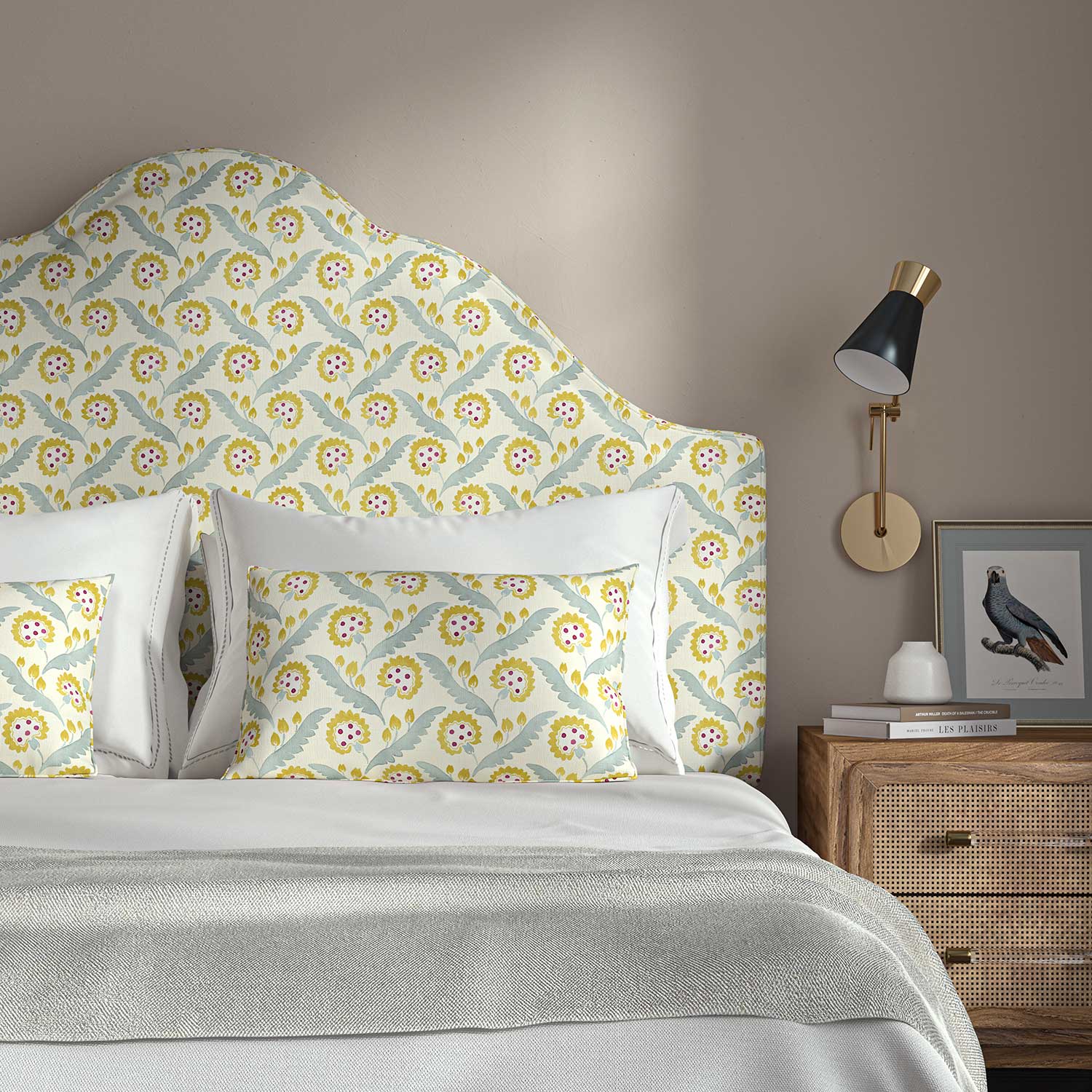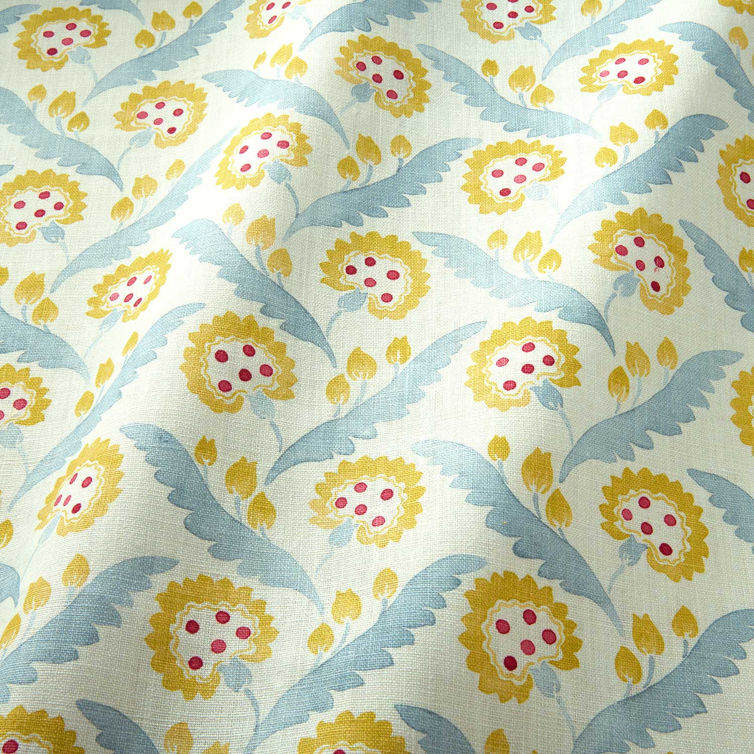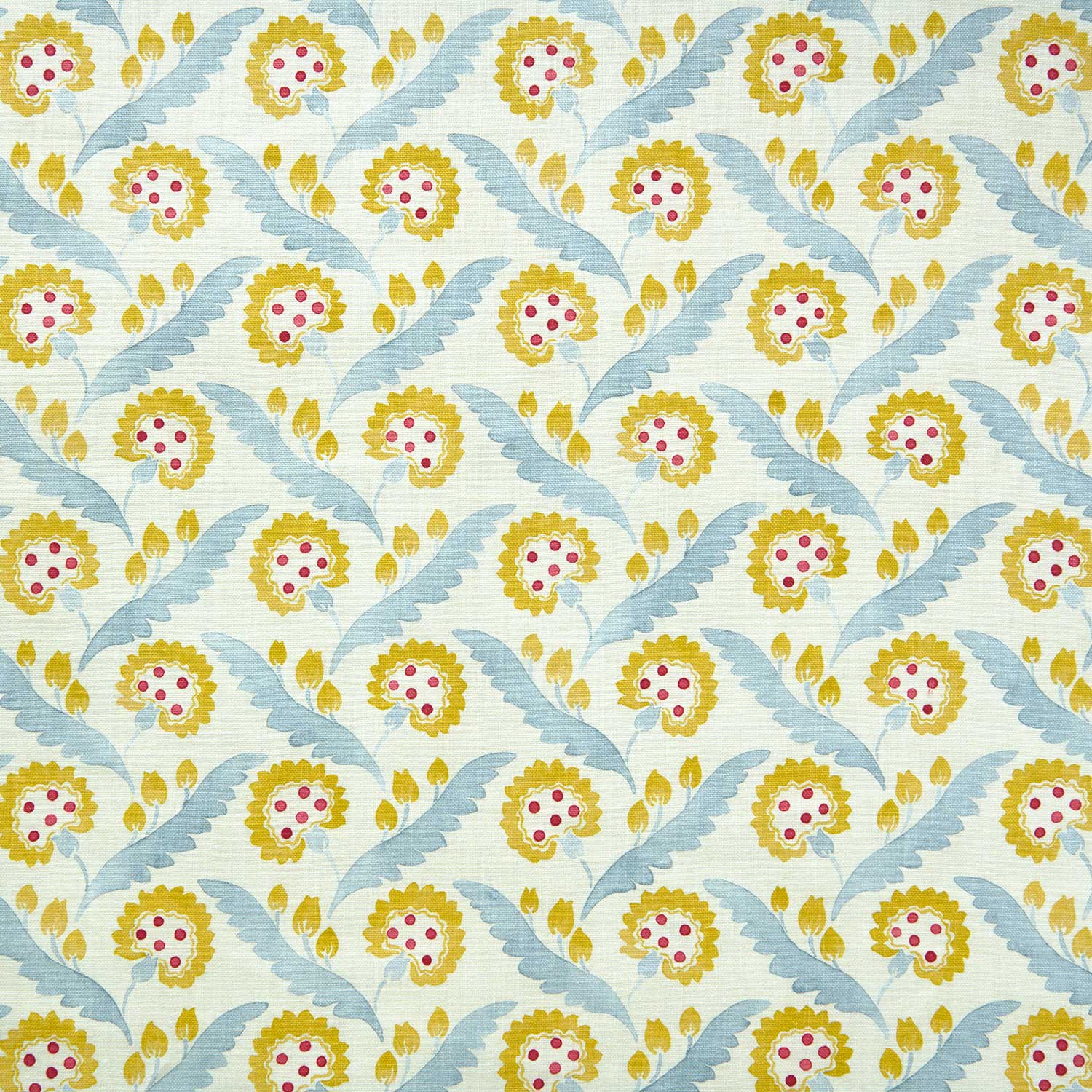 Polly, which was carefully hand painted using watercolours at the Linwood studio, features a stylised flower reminiscent of a dandelion. The resulting tonal design, presented on the finest linen, would bring a playful yet calming touch to any furniture or curtains.