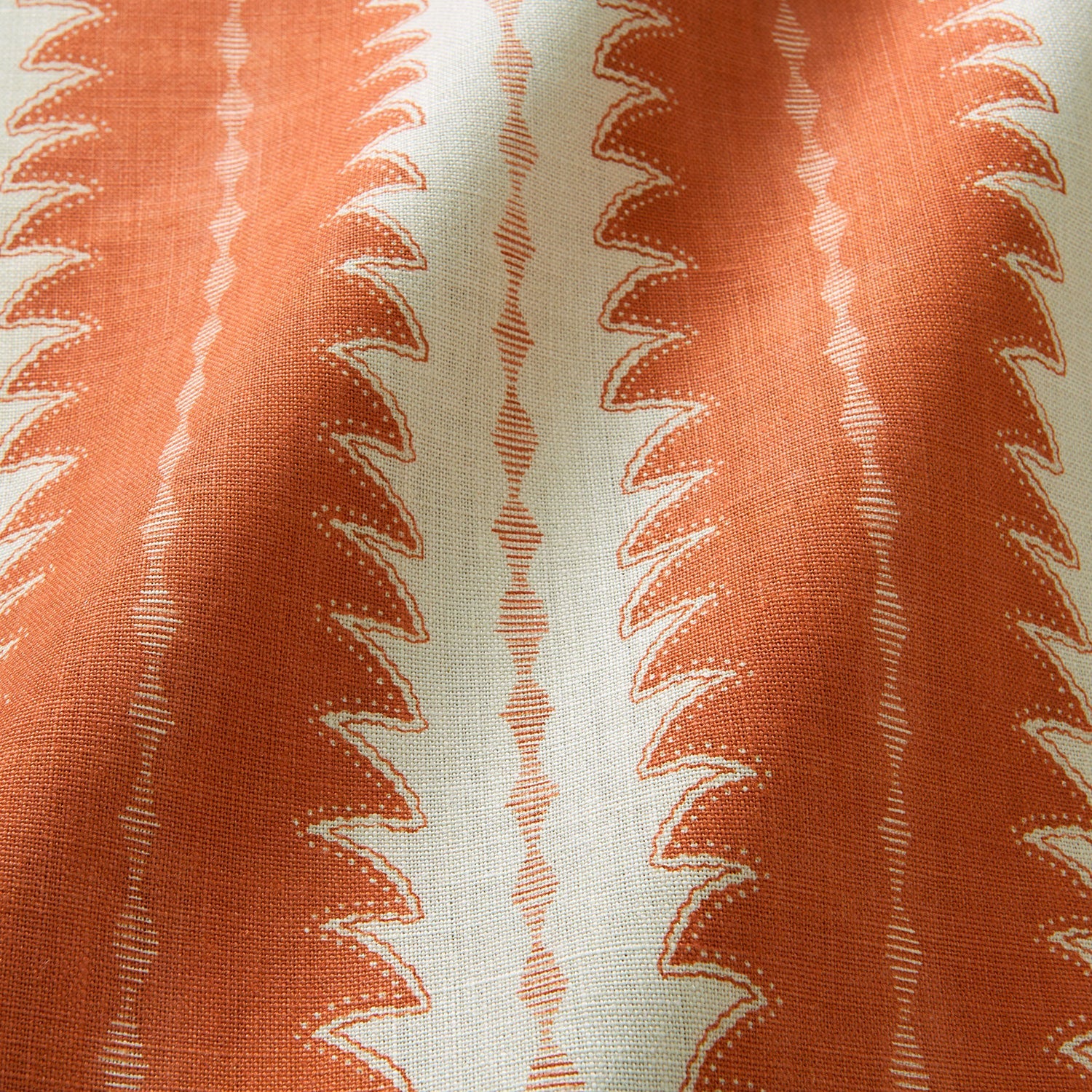 This attractive ‘fern’ design incorporates charming motifs such as dotted lines and simple dashes, lending the printed linen fabric an inviting look. Ruched, fashioned from an antique Japanese fabric, would liven up any scheme’s curtains or upholstery.