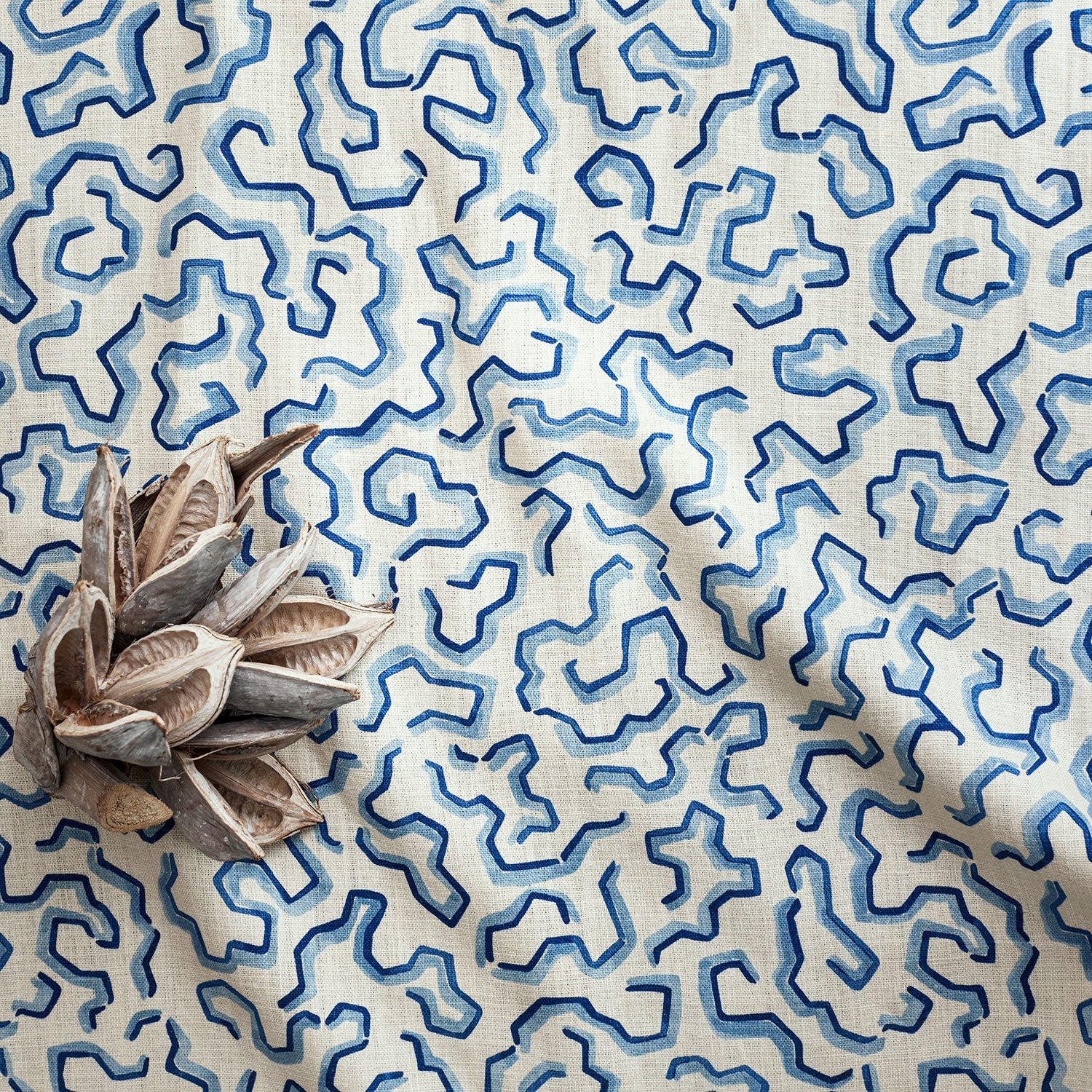 Scrunched, which twists in every direction, conveys the look of a classic animal pattern, yet unique design elements like dark and light shading offer depth of movement. This design, printed on pure linen fabric, is excellent for upholstery as well as curtains.
