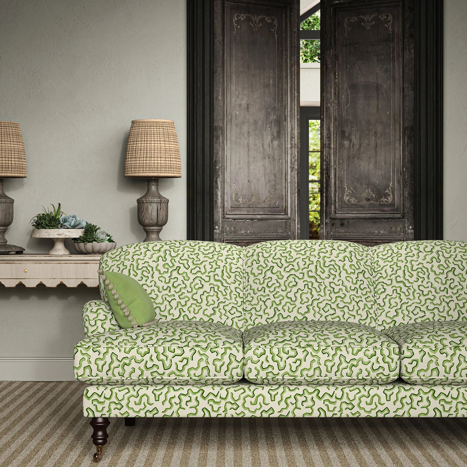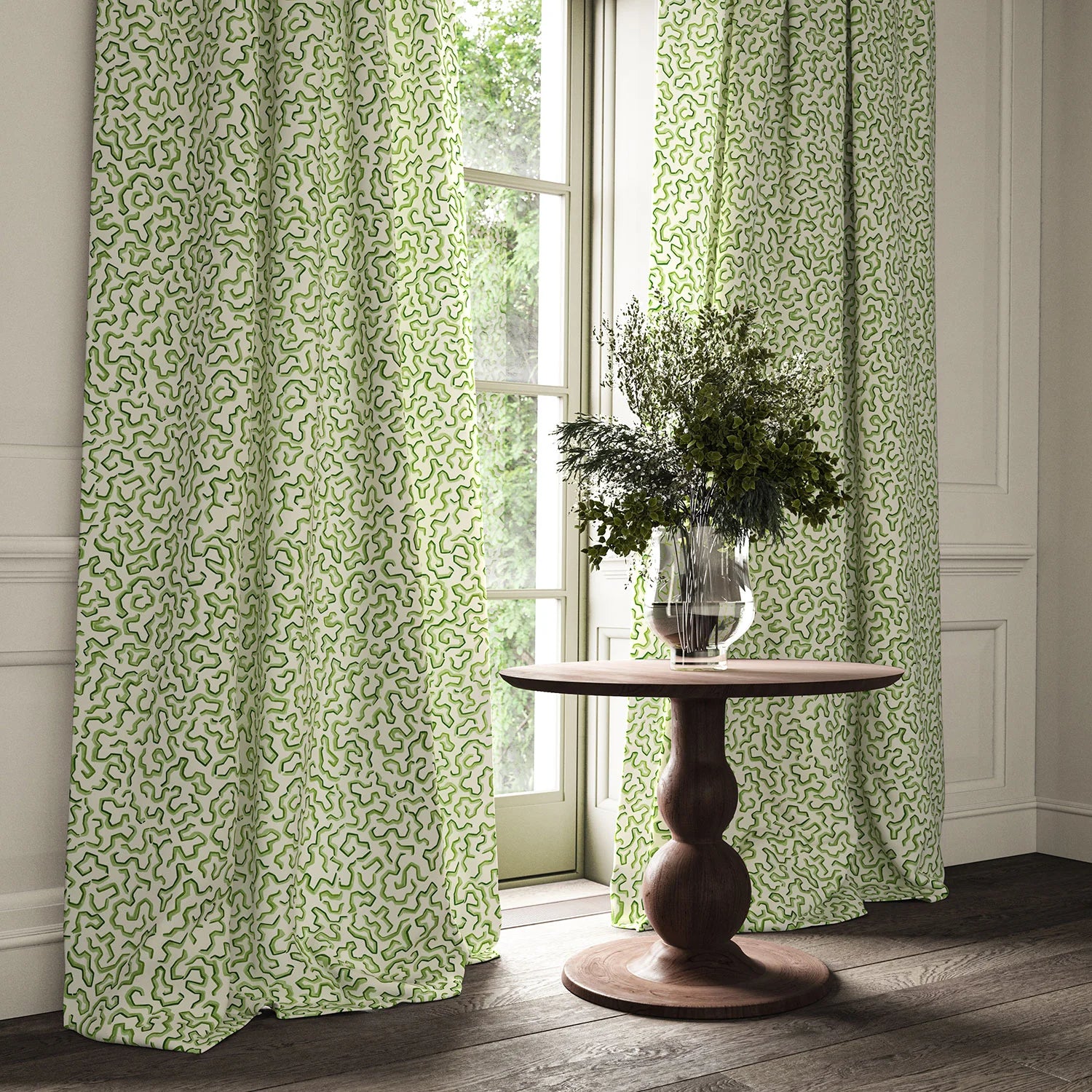 The fabric design is shown flat on the above image. Patterned fabric will look different when made into curtains as it will hang in rippled folds.