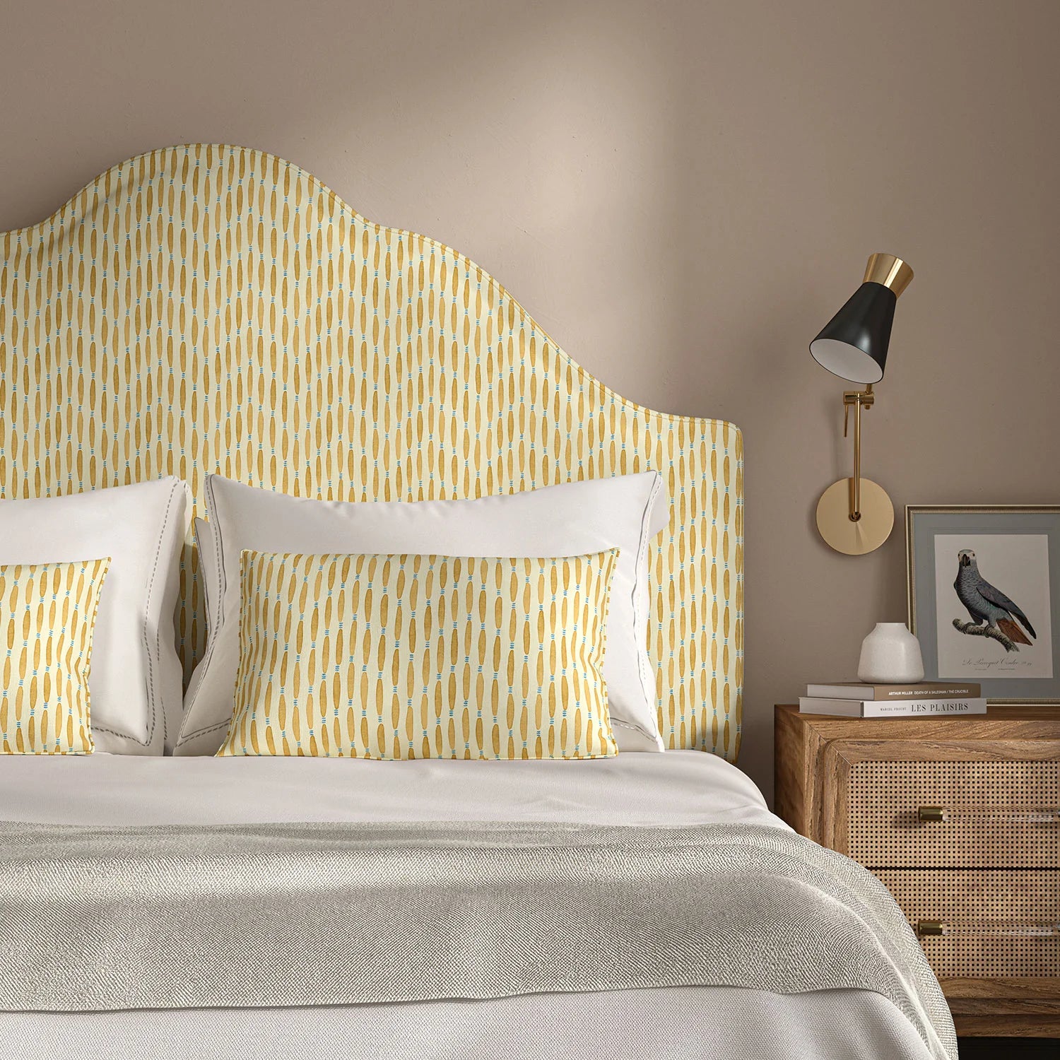 This beautiful small-scale pattern, printed on 100% linen fabric, will fulfil all of your upholstery and curtain needs. Smocked, which is based on a Japanese print, was repainted at our studio. The resultant design is filled with fascinating tonal movement. Available on two grounds, neutral and coloured.
