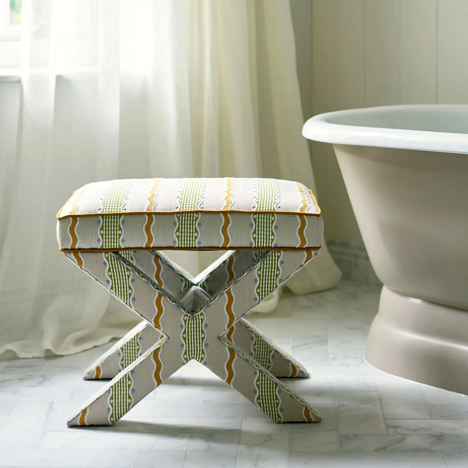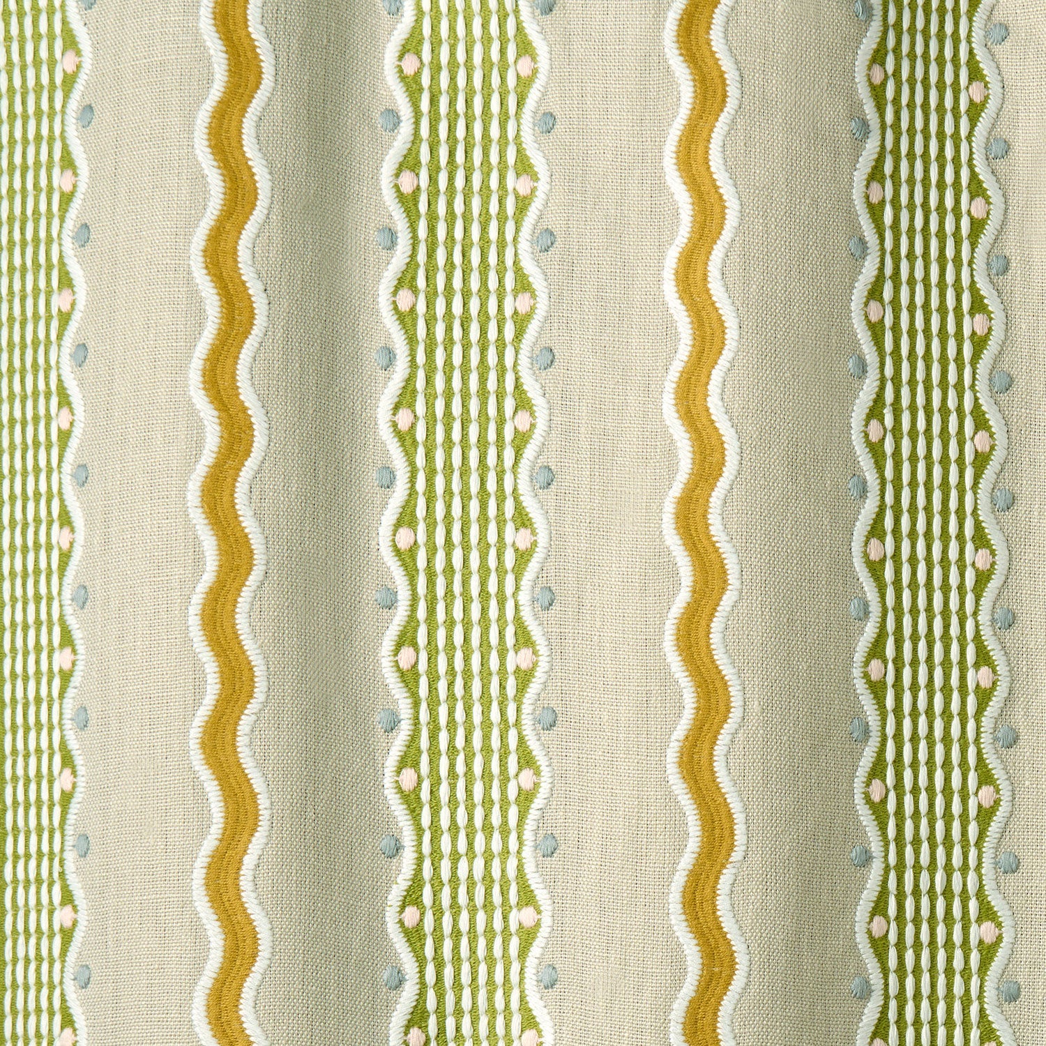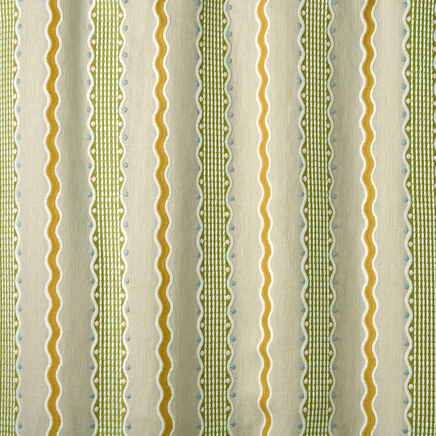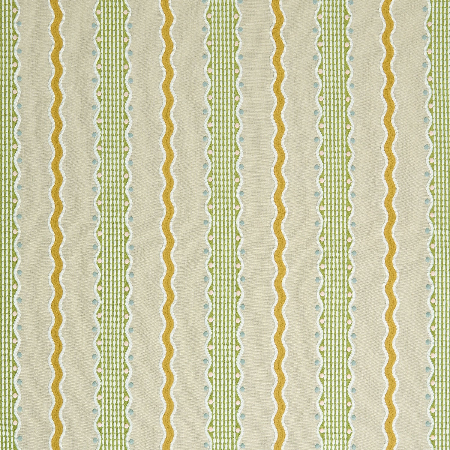 A playful reimagining of the classic stripe, this embroidery combines bold, undulating waves with finely stitched geometric bands to create a lively rhythm of movement and order. Inspired by a 1930s wool embellishment, the design embraces a more naive stitch, with raised details and contrasting textures adding depth and relief. Embroidered on pure linen, it is a versatile choice for curtains, blinds, or decorative upholstery – introducing colour, character, and artisanal charm to both modern and traditional interiors.