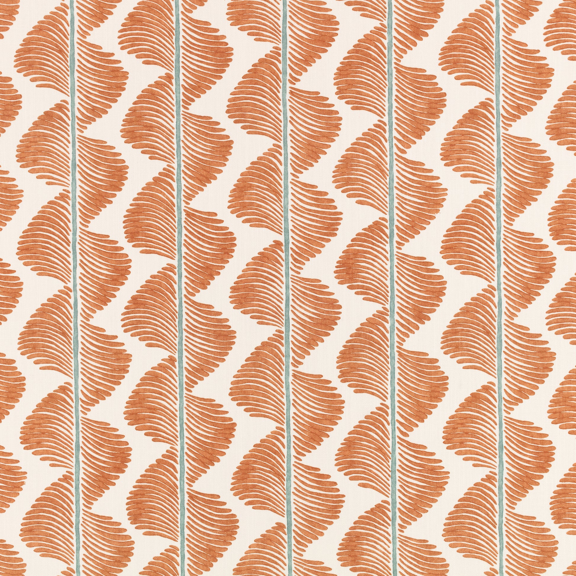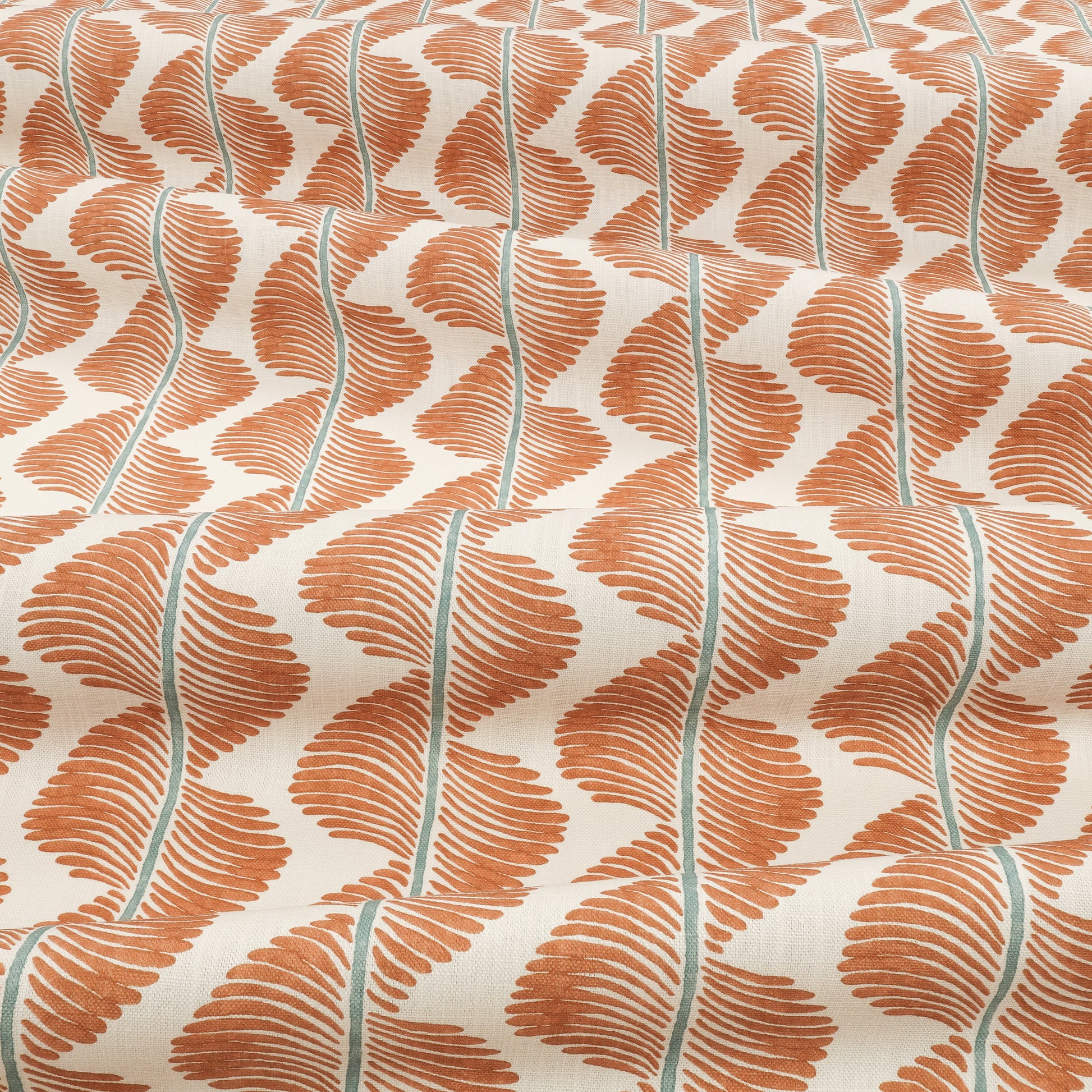 A mesmerising wave of pattern with a vibrant flash of colour swirls down the cloth to form a striking stripe design. Printed on an organic and recycled cotton linen blend, details of the original hand-blocked artwork can be seen in the print. Subtle variations in shade and distinct markings create a truly unique design that celebrates the rich history of pattern making.
