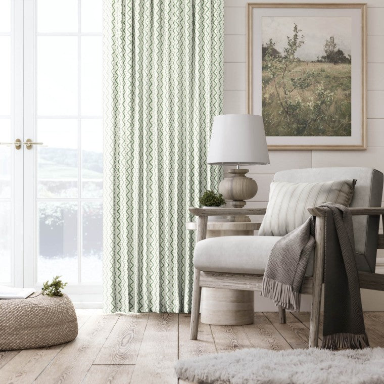 The fabric design is shown flat on the above image. Patterned fabric will look different when made into curtains as it will hang in rippled folds.