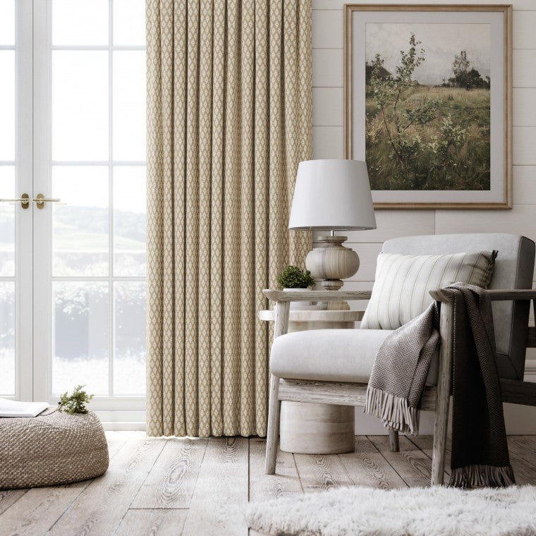 The fabric design is shown flat on the above image. Patterned fabric will look different when made into curtains as it will hang in rippled folds.