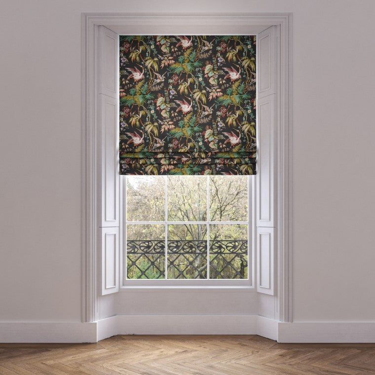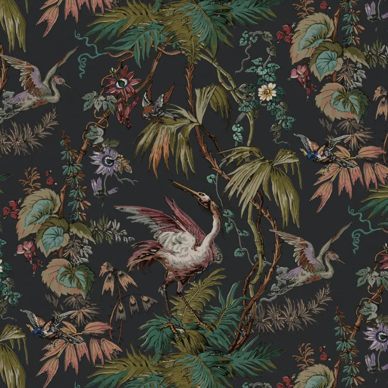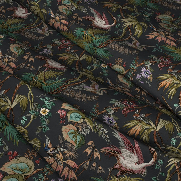 Based on a late 18th century English toile print from Bromley Hall, this meandering tropical floral velvet print with passion flowers and herons, comes in five glorious colourways. Choose the Ebony colour story as a statement fabric, perfect for dramatic drapes or a statement piece of furniture.