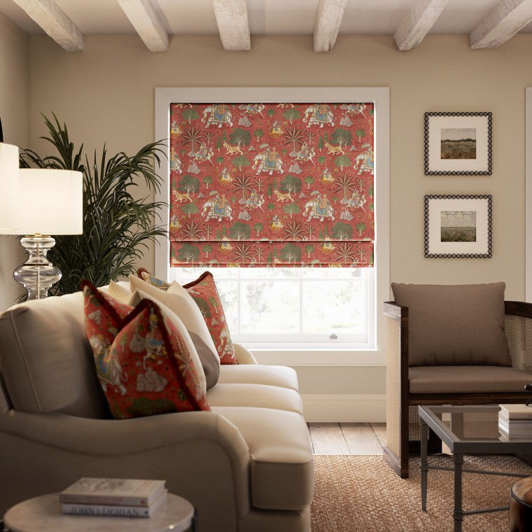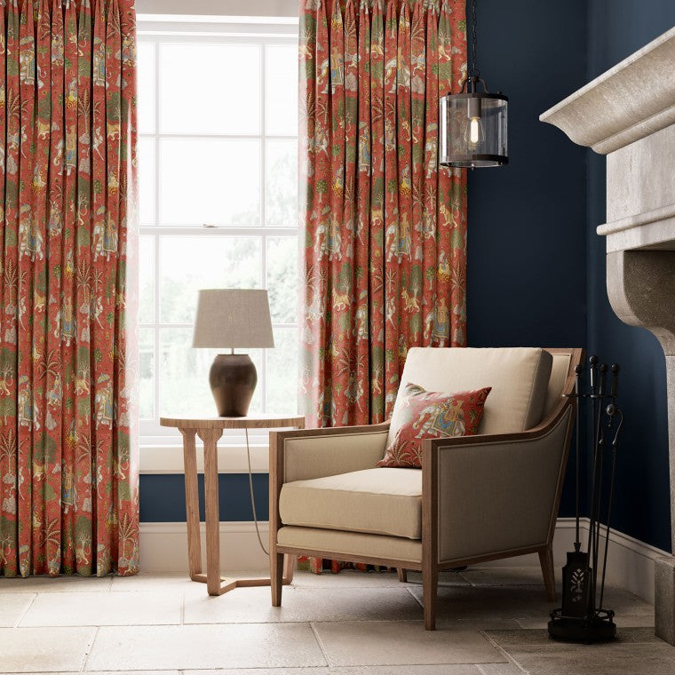 Based on the pictorial Chamba Rumals of the 17th and 18th centuries, this printed velvet fabric featuring a charming scene of a highly decorated elephant, his passengers and a musician playing his sarod is printed onto velvet in four mystical colourways, showcased here in the vivid Jade colour way, a beautifully rich and bold choice for a maximalist look.