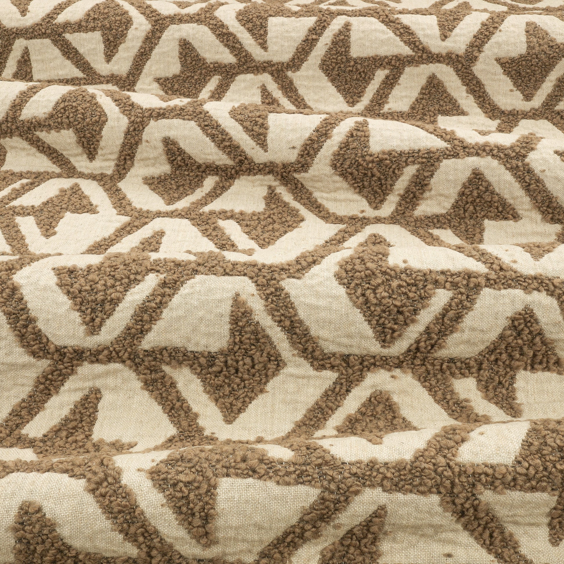A highly textured wool bouclé creates a detailed hexagon-like pattern on a linen pocket weave with a super chunky feel. These rustic qualities culminate in a relaxed, hand finished appearance with random speckles of bouclé peppering the linen ground, which only adds to the cloth’s character.