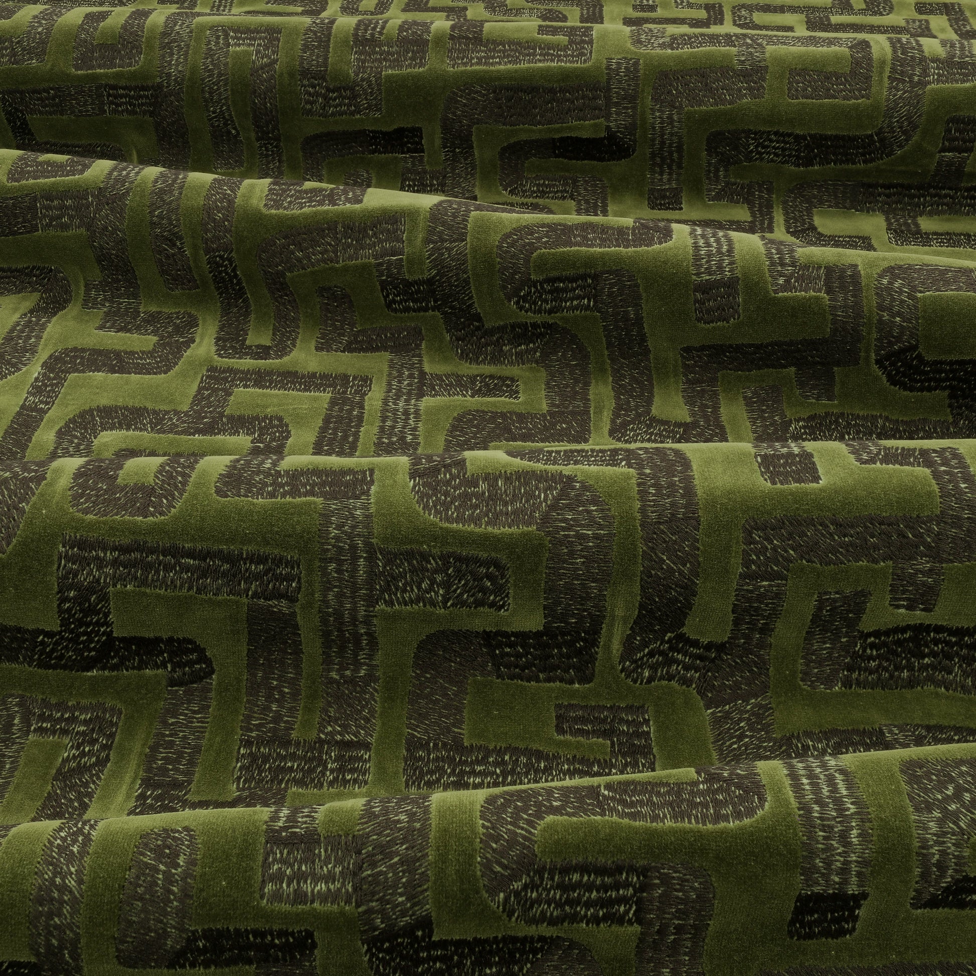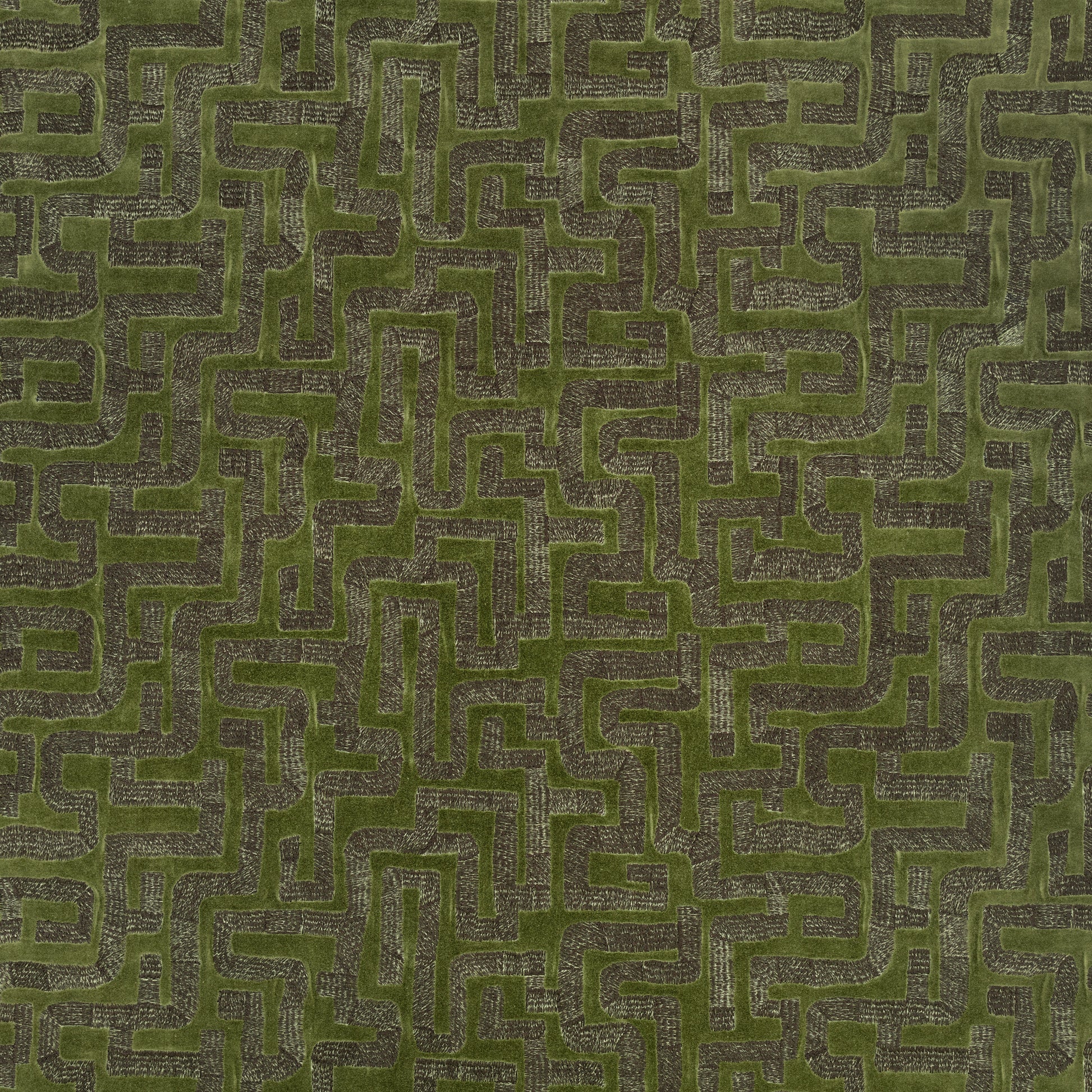 A super smart, matte cotton velvet embroidered with a deliberately primitive labyrinth design inspired by a Congolese mud cloth. The naivety of the pattern and subtle crease in the ground give this distinctive fabric it’s appealing aesthetic.