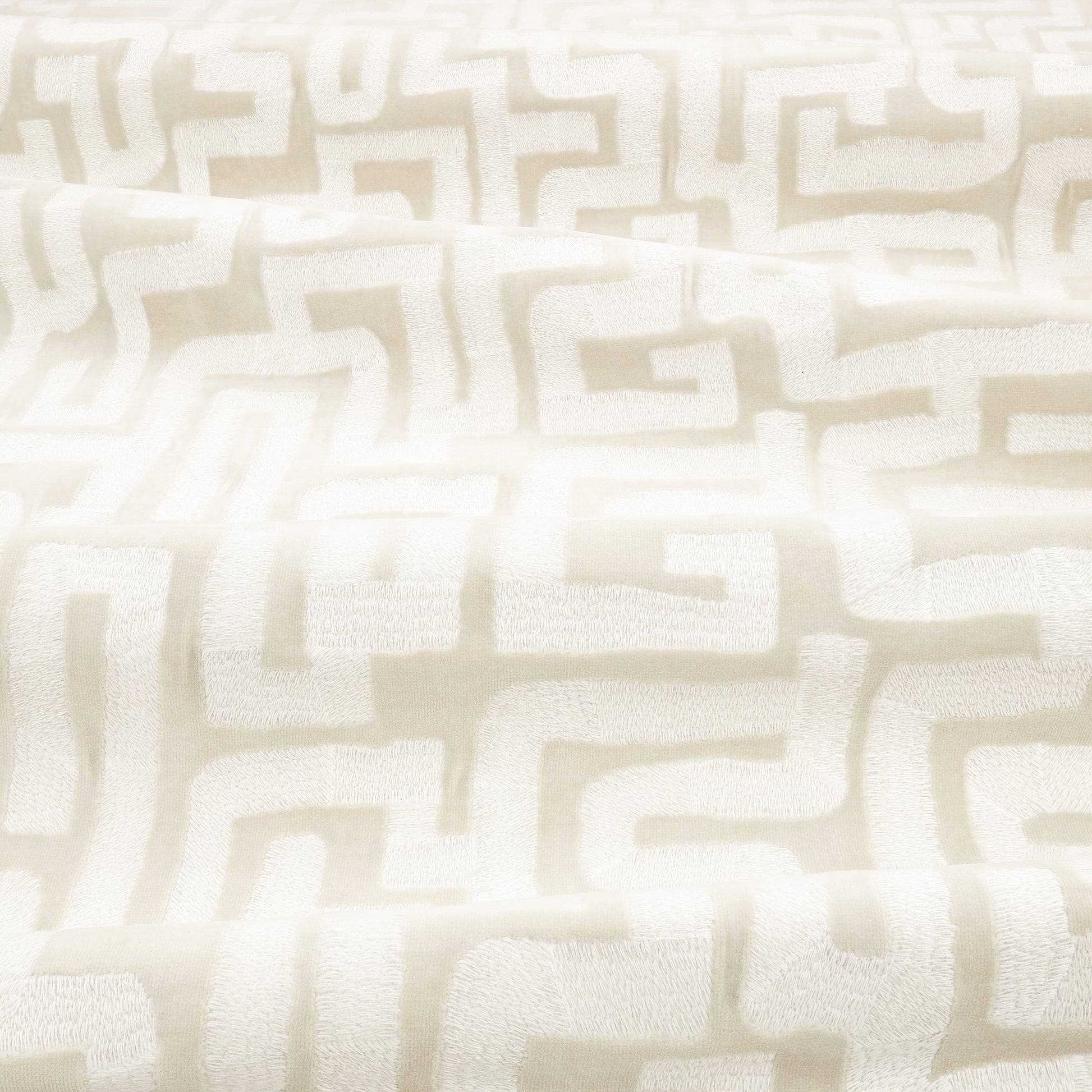 A super smart, matte cotton velvet embroidered with a deliberately primitive labyrinth design inspired by a Congolese mud cloth. The naivety of the pattern and subtle crease in the ground give this distinctive fabric it’s appealing aesthetic.